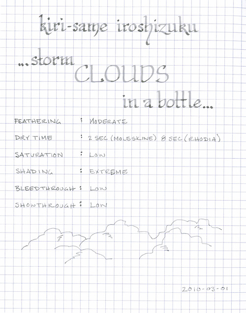 As with the other Iroshizuku inks, Kiri-same comes in a beautiful, solid, 50 ml bottle that looks great on one’s desk. The bottle has a depression in the base to allow for the last drops to be claimed with ease. The only minor drawback to this ink is the cost – for a comparable volume, Iroshizuku tends to run 50% to 100% more than other inks.