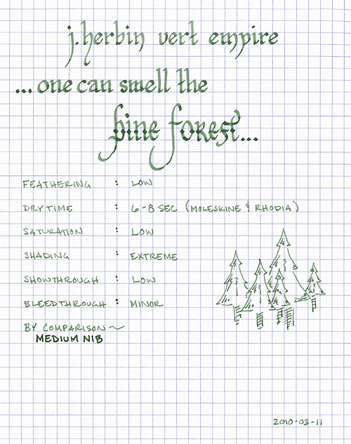 J. Herbin Vert Empire is a forest green ink with grey undertones. To me, it is invocative of a pine forest in the hazy light of morning. It is a wet ink with low saturation, so it exhibits a tremendous tonal range, depending on the pen and paper used. In most of my pens it displays significant shading, whereas in a wet writer it lays down a very dark line. Also, the ink takes on the character of the paper – for example, it takes on slight olive tones when used with the off-white paper of Moleskine journals.