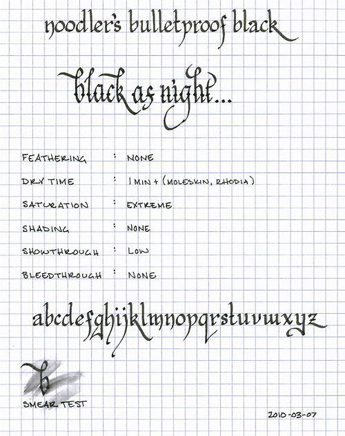 First, Noodler’s Black is as black as night. Pitch black. When poets refer to an inky blackness, this is the ink that they have in mind. It is extremely saturated and lays down a very opaque, non-shaded line in every nib and on every paper that I’ve used it with. It’s so saturated that it doesn’t matter what color or texture paper one uses – the result is a solid black line.