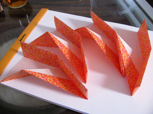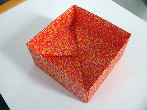 This origami box was folded from 8 uncut sheets of paper: 4 double sided (lid) and 4 patterned (base). The box was assembled entirely without glue or fastener of any sort, as the four units for the base and lid all slot together to form a structurally stable unit. The completed box measures about 3 inches square.