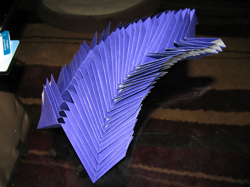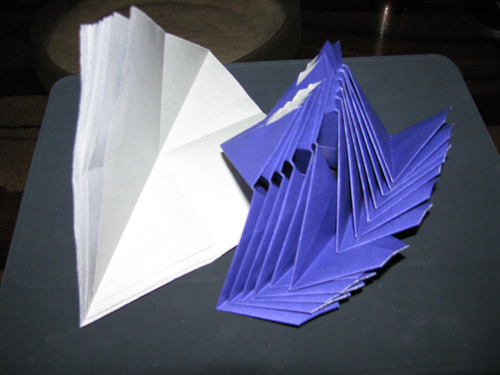 It took approximately three hours to fold all of the individual units. This is about two thirds of the way through. I’ve done preliminary folds on all of the sheets of paper, and then finished folding about half of the full units.