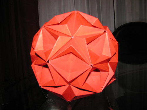 The above is a kusudama folded from 30 squares of paper. Each square of paper is folded into a modular unit, and then the units are assembled without any adhesives or other external connections - they are simply slotted into each other. This model took approximately four hours to fold and assemble.