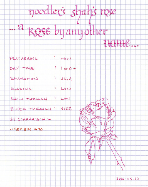 I don’t normally use pink inks; I bought Shah’s Rose to mix with other inks, and I suspect that will be its main function. The ink is a bit too light in tone to be pleasant to read on a regular basis, though it behaves quite well in all other respects. It is a beautiful color, and I may use it in other artistic endeavors – but probably not for daily use.