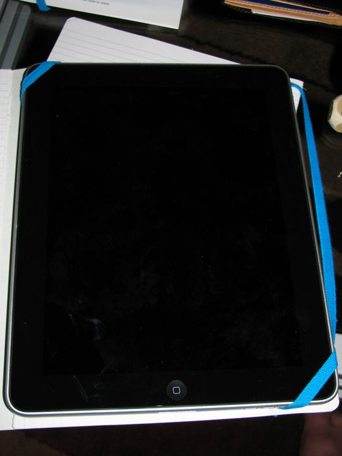 The next step was to figure out how to affix the iPad to the notebook. I decided to cut the bookmark in half and use it to create holders for the corners. Below, you can see the iPad with the bookmarks in place.