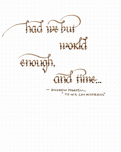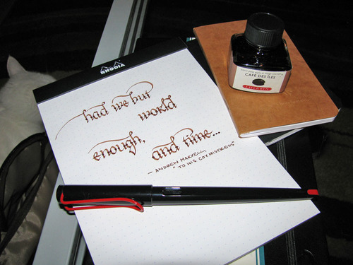 All of the Rhodia pads are staple bound, and have either an orange or black cardstock cover that is pre-scored to allow it to fold back over the spine easily. The microperforated pages are easy to remove, and the cardboard backing is sturdy enough to be able to hold the pad without separate support. The version I typically use has a pale, violet, 5x5 ruled grid, which is perfect for calligraphy – the vertical lines help with word and letter spacing, as well as providing a guide for consistent letter angles.