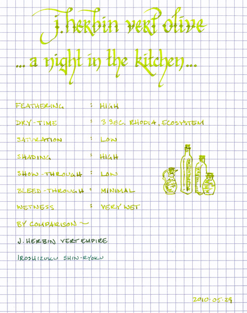 While Vert Olive is a beautiful ink, due to its brilliant color I can only see using it for editing, highlighting, calligraphy, or other artistic endeavors.