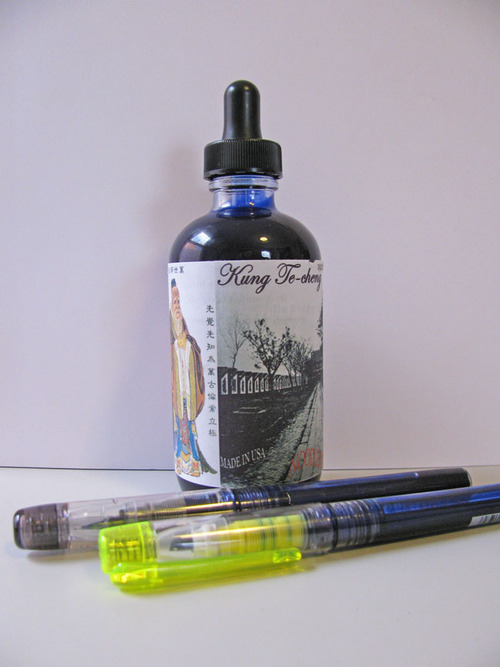 Unlike most Noodler’s inks, Kung Te-Cheng ships in a circular 4.5 oz bottle with an eyedropper lid. Like their other inks, the bottle is stark and utilitarian – nothing you’d want to set on top of your desk to display. It also comes with a Platinum Preppy fountain pen and a Platinum Preppy highlighter that have been converted to an eyedropper feed.