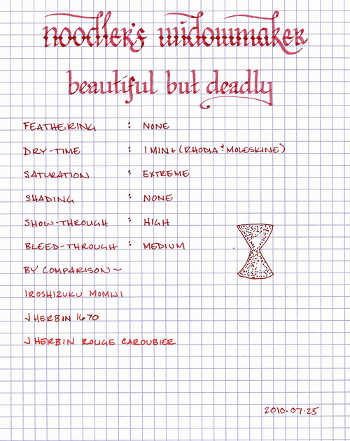 Like most other Noodler’s inks, this one is very highly saturated, so I advise shaking the ink bottle before filling to make sure the dye is evenly distributed. Also, good pen hygiene is important; make sure to flush your pen well between every few fills of this ink. However, the high saturation does result in a very consistent line – in all but the widest nibs there is no shading to speak of. Also, as is common with Noodler’s ink, Widowmaker is very feather-resistant. I saw almost no feathering on any of the paper I tested it on, including garden variety copy paper, which tends to feather dramatically with most fountain pen inks.
