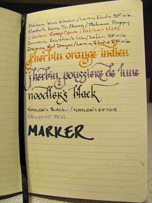 The 90 gr paper is thick enough to stand up very well to the wettest inks. I noticed no bleed-through from fountain pen inks at all during my testing, and the amount of show-through is noticeably less than in a Moleskine notebook. It also handles other media well – I had no trouble with a garden-variety ballpoint pen. A permanent marker bled through, but did not mark the underlying page.