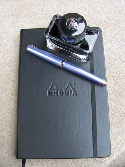 Well, I’ve never been more tempted to jump ship than I am now – the A5 Rhodia Webnotebook is fantastic. It is slightly larger than a large Moleskine journal – the same height, but about half an inch wider. It is approximately the same thickness, though it contains 96 sheets (192 pages) of paper versus the 120 sheets (240 pages) of a Moleskine, and has similar accoutrement: a sewn-in ribbon bookmark, a pocket on the inside of the back cover, and an elastic closure that runs vertically from top to bottom. Additionally, its signatures are stitched, so it lies flat when open.