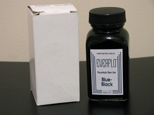 Let’s not get ahead of ourselves. Everflo is a new line of ink introduced by the Gate City Pen and Ink Company, a partnership established in 2010 between well-respected nibmeister Richard Binder and Jim Baer. Their stated purpose is to build vintage-style, handmade pens, and to offer ink with vintage behavior to match. However, I’d bet my trusty Lamy Safari that Everflo is actually produced by Noodler’s Inks for Gate City. The bottles, caps, and even boxes are exactly the same as Noodler’s Ink – even down to the marks on the bottom of the bottles.