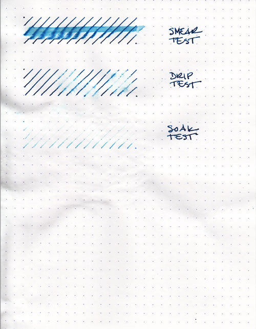 Water resistance is intentionally absent, as Everflo inks are designed to be washable. The smear test, in which I ran a wet finger across the page, left an illegible blue streak. The drip test, in which I let a drop of water sit for a minute before blotting it, raised nearly all of the ink from the page. The soak test, in which I run the paper under a stream of water, was quite effective in eliminating almost any trace of the ink. Pleasantly, the ink washed right out of my pens, as well, leaving no trace behind.
