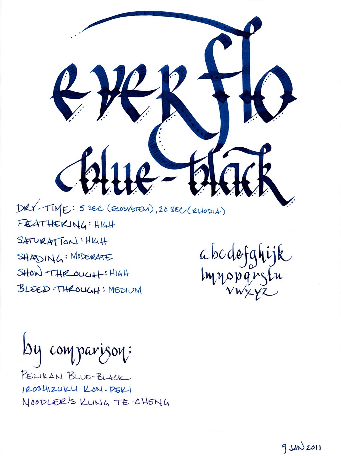 After I’ve finished writing an ink review, I’m left with anywhere from four to six pens lying around with several milliliters of ink still in them. Typically, I empty the pens back into the ink bottle they came from, in order to save the ink for later. Occasionally, I like an ink enough that it stays in the pen I used to test it until I’m distracted by the next wonderful ink to cross my desk. More rarely, I’ll be so crazy about an ink that it takes up near-permanent residence in my ink rotation: Noodler’s Kung Te-Cheng, Diamine Imperial Purple, J. Herbin 1670. Everflo Blue-Black, on the other hand, is the first ink that went right down the drain.
