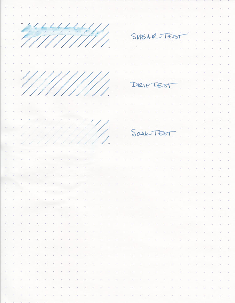 For an ink labeled as permanent, though, it is anything but waterproof. The smear test, in which I drag a wet finger across the page, produced a lovely teal smudge which obliterated any trace of the underlying line. The drip test, in which I let a drop of water sit on the paper for a minute before blotting, lifted a significant amount of ink from the page.