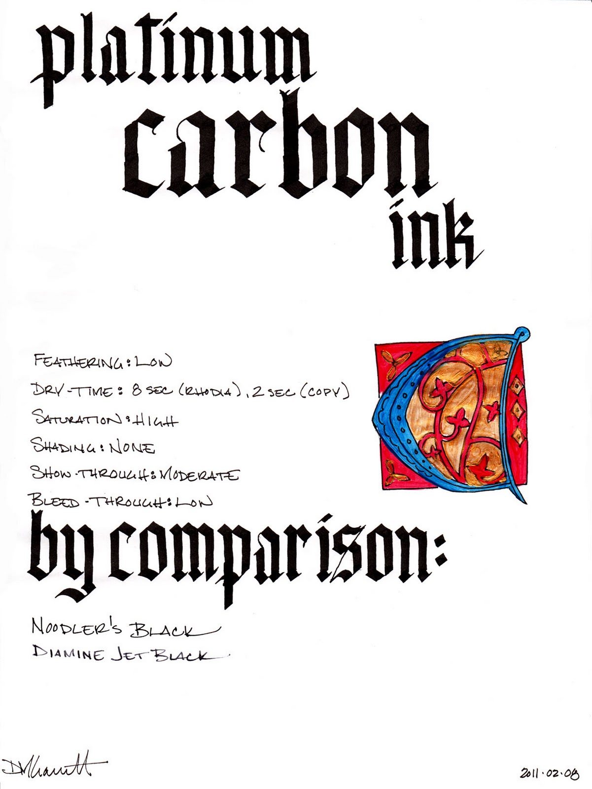 Review materials: For the wide strokes, I used Pilot Parallel 6.0mm and 3.8mm calligraphy pens. They both have steel nibs. For the fine strokes, I used a Lamy EF steel nib on a Lamy Safari. The illuminated letter was outlined with a Lamy EF nib and then painted over with acrylic paints and a brush. The paper is Rhodia 80g.