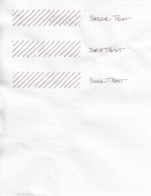 The smear test, in which I run a wet finger over the paper, reveals that the ink can be smudged with a bit of effort. If you look close, you can see a fine light-grey tint to the paper where I dragged it across the lines. On the other hand, the drip test, in which I let droplets of water settle on the page before blotting them up, and the soak test, in which I run the paper under the faucet for a minute, show that the ink hasn’t moved one bit. It doesn’t look like it got water near it at all – a major difference from most dye-based inks.