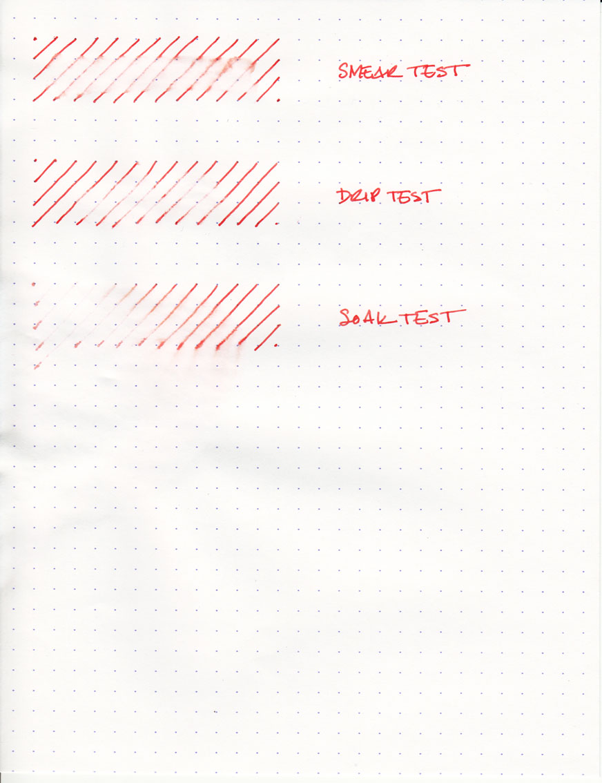On the drip test, in which I let droplets of water sit on the page for a minute before blotting, about fifty to seventy percent of the ink came up from the page. Certainly not ideal, but not a disaster, either. The soak test, in which I held the paper under the faucet for a few moments, lifted much of the ink that was directly targeted. However, the ink in the “splash” zone remained legible, which is not often the case. Overall, Morinda provides a modicum of water resistance - certainly more than I expected. It is a mark in its favor.