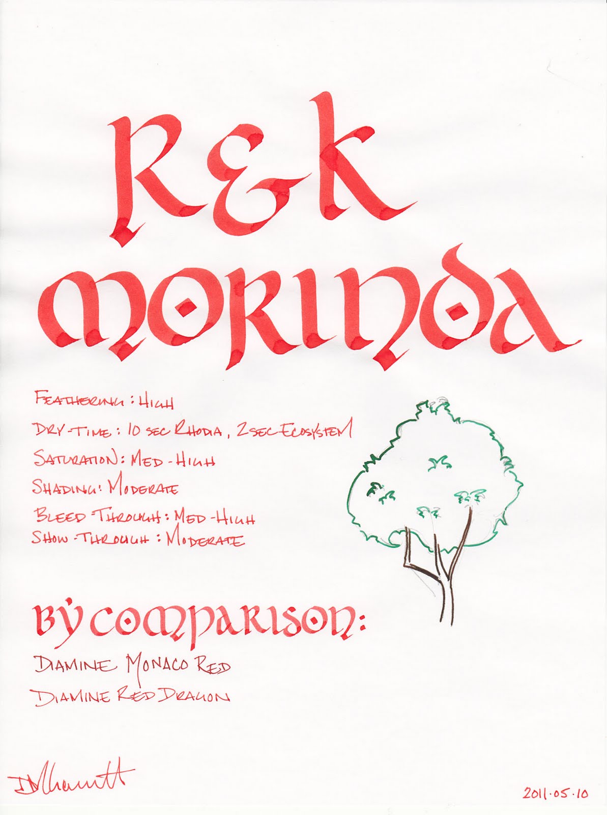 Note on the scan: the Morinda ink washed out a bit when scanned in, so the actual color is a tad more vibrant and saturated. It is a fairly accurate representation of the character of the ink otherwise.