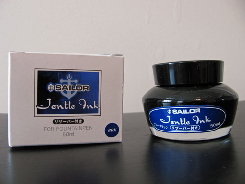 Sailor inks come in a bottle that looks like a cold-cream jar – though I suspect the water-resistant blue-black ink would make a poor cosmetic substitute for anyone but zombies. More interesting, perhaps, than the bottle’s outward appearance, though, is the mechanism it has built-in for facilitating the filling of pens.