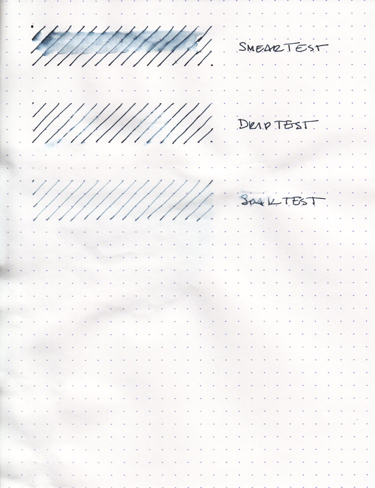 Sailor Blue Black did better than I expected on the water tests. It showed the worst behavior on the smear test, in which I dragged a wet finger across the page and got a nice blue-black smear for my effort. While the lines on the page were not destroyed, the smeared ink is dark and saturated enough to make it hard to read.