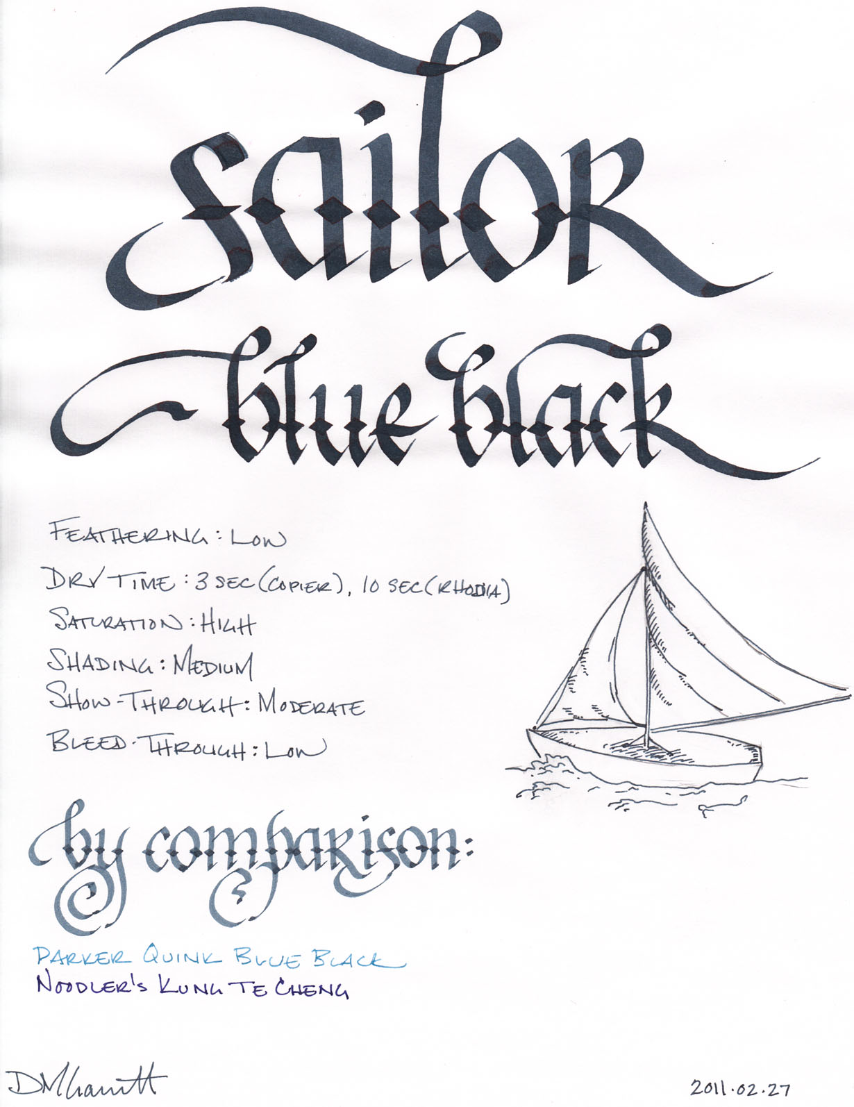 Sailor Jentle Blue Black is a very pleasant, easy to use, blue-black ink. It is a dark blue with tinges of black - exactly what I would expect from a blue-black ink, and exactly unlike the Parker Quink Blue Black I reviewed previously. It is a moderately wet ink, compared to the Parker Quink, and therefore writes with a bolder line. It is highly saturated and exhibits a medium level of shading in a fine-nibbed pen.
